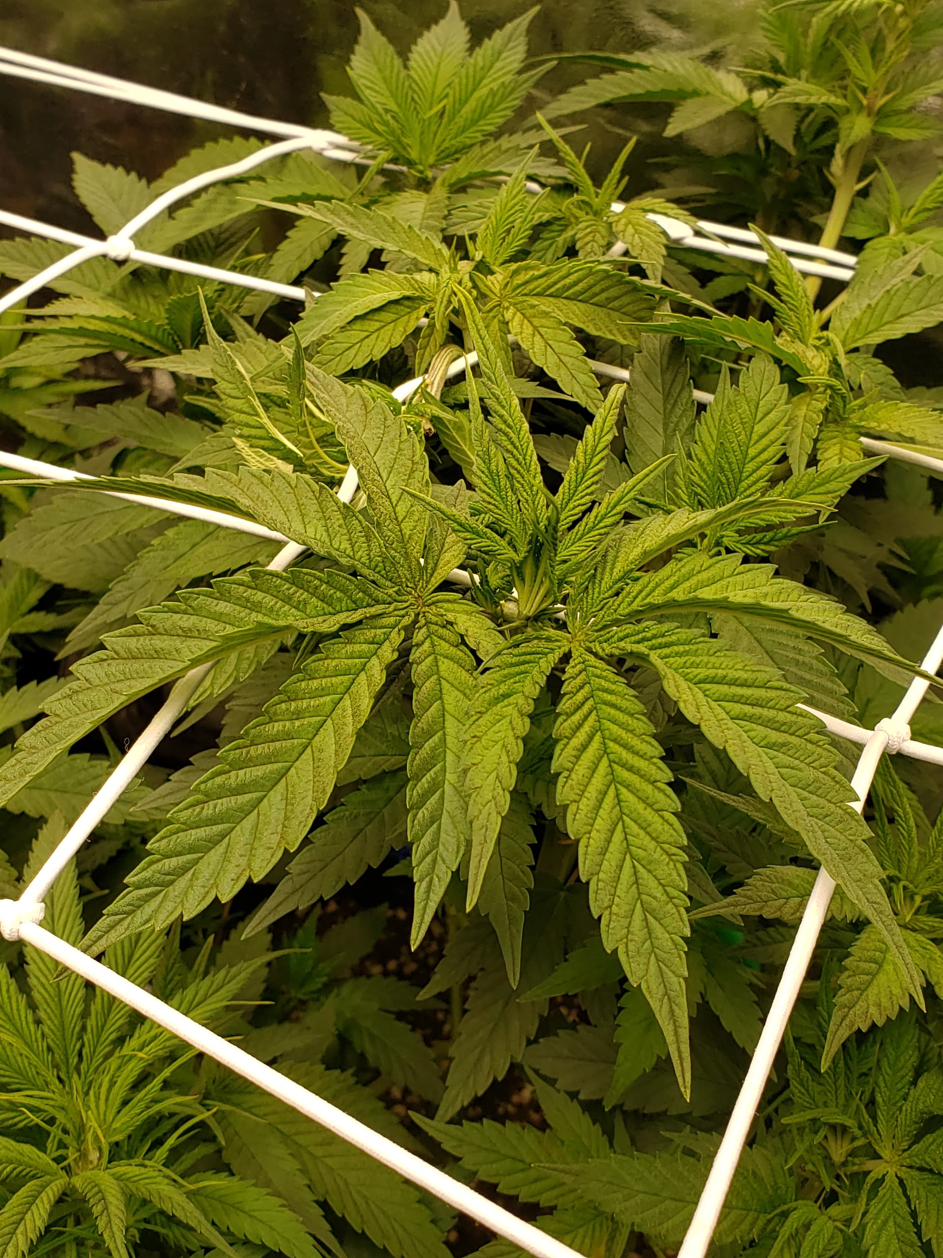 So after I raised the light plants have been thriving. They are really starting to fill in the scrog netting. The first trio nutes have been doing the plant well. I’ve also added the open sesame line to help with growth. They were super bushy this morning so I took the snips to em and viola, took about a pound worth of leaves off. I don’t have a before pic but they definitely needed the haircut.