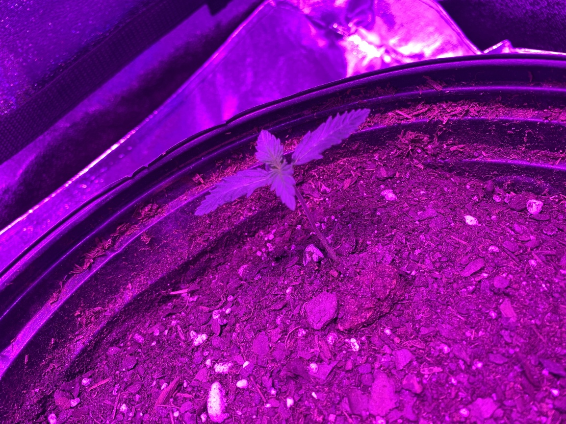 Seedling is bubblegum auto, growing in Happy Frog. In a grow tent 18 inches under Mars Hydro. So far only misted the dirt with water spray bottle.