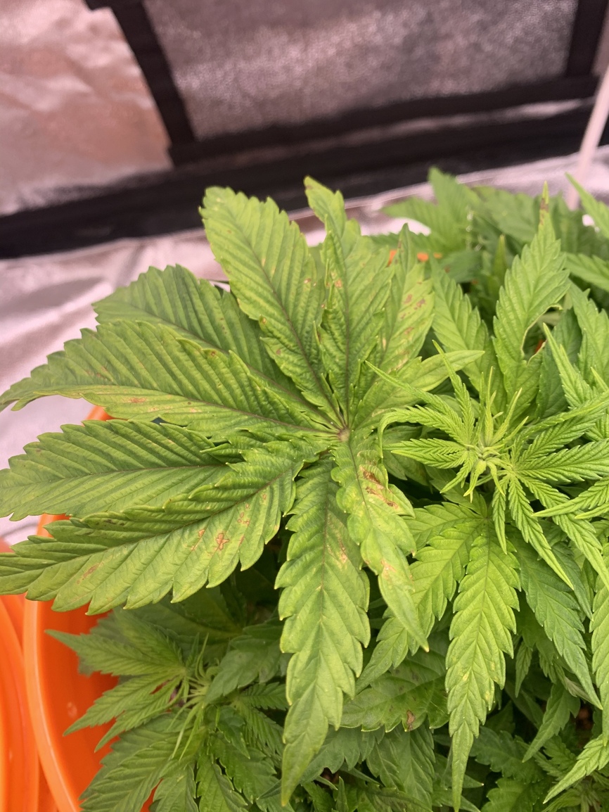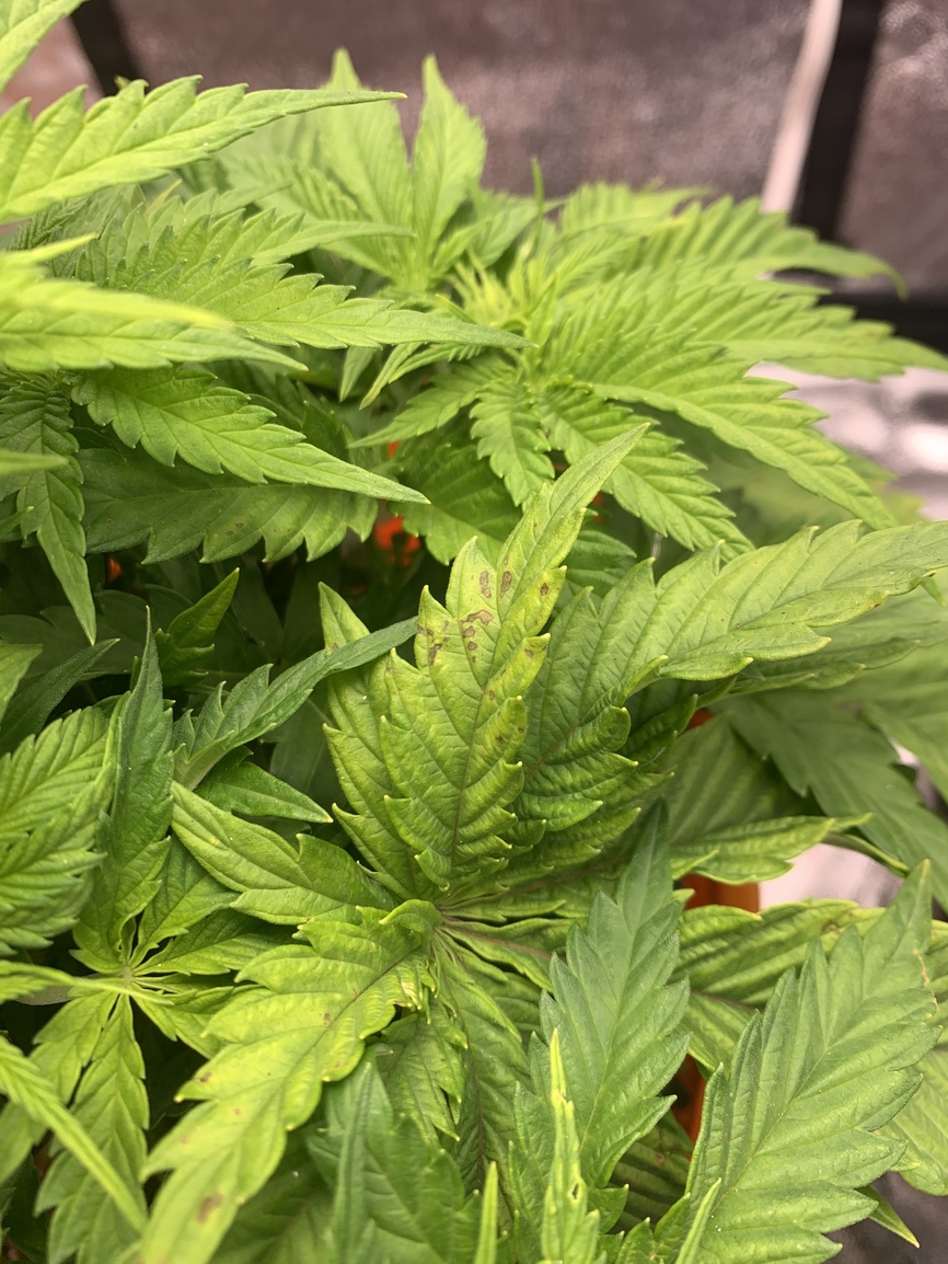 Thanks for the welcome. The lights are two spider farmer sf2000s at 24" away. This is the only plant affected. The other gold leaf bounced back from my newbie mistakes and is responding well to lst with no signs of spots. I also have a chocolate skunk that is thriving at the same distance.