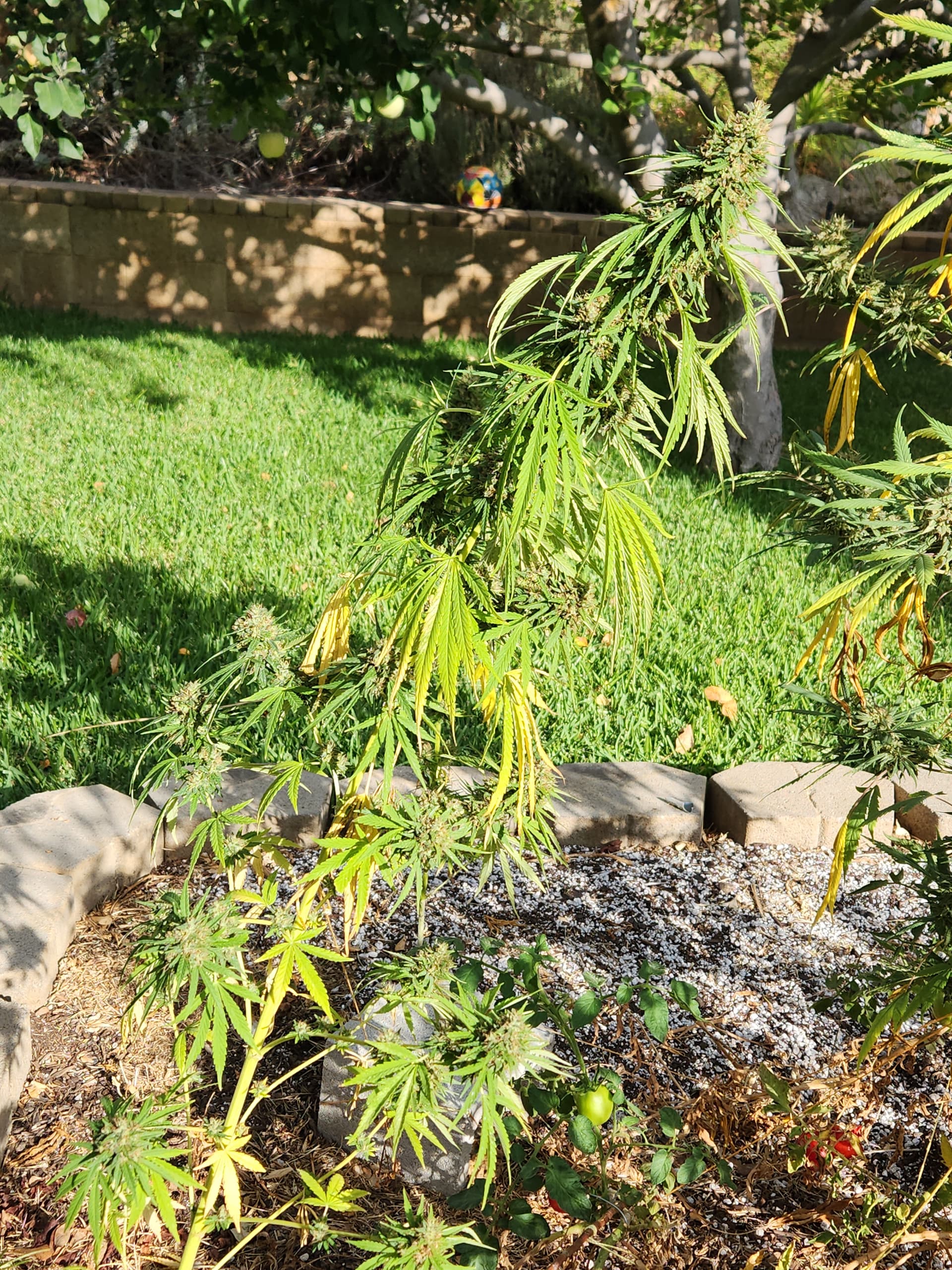 Looking good. I cut down the strawnanna and buried her today. The hellfire in bottom garden has beautiful fat buds. Purples coming out on her nicely. But the mold and mildew will take most of her. The top garden Hellfire has a potassium issue and most of her leaves have turned crispy and died. I’m praying she will hold out another 2 weeks. ![]()