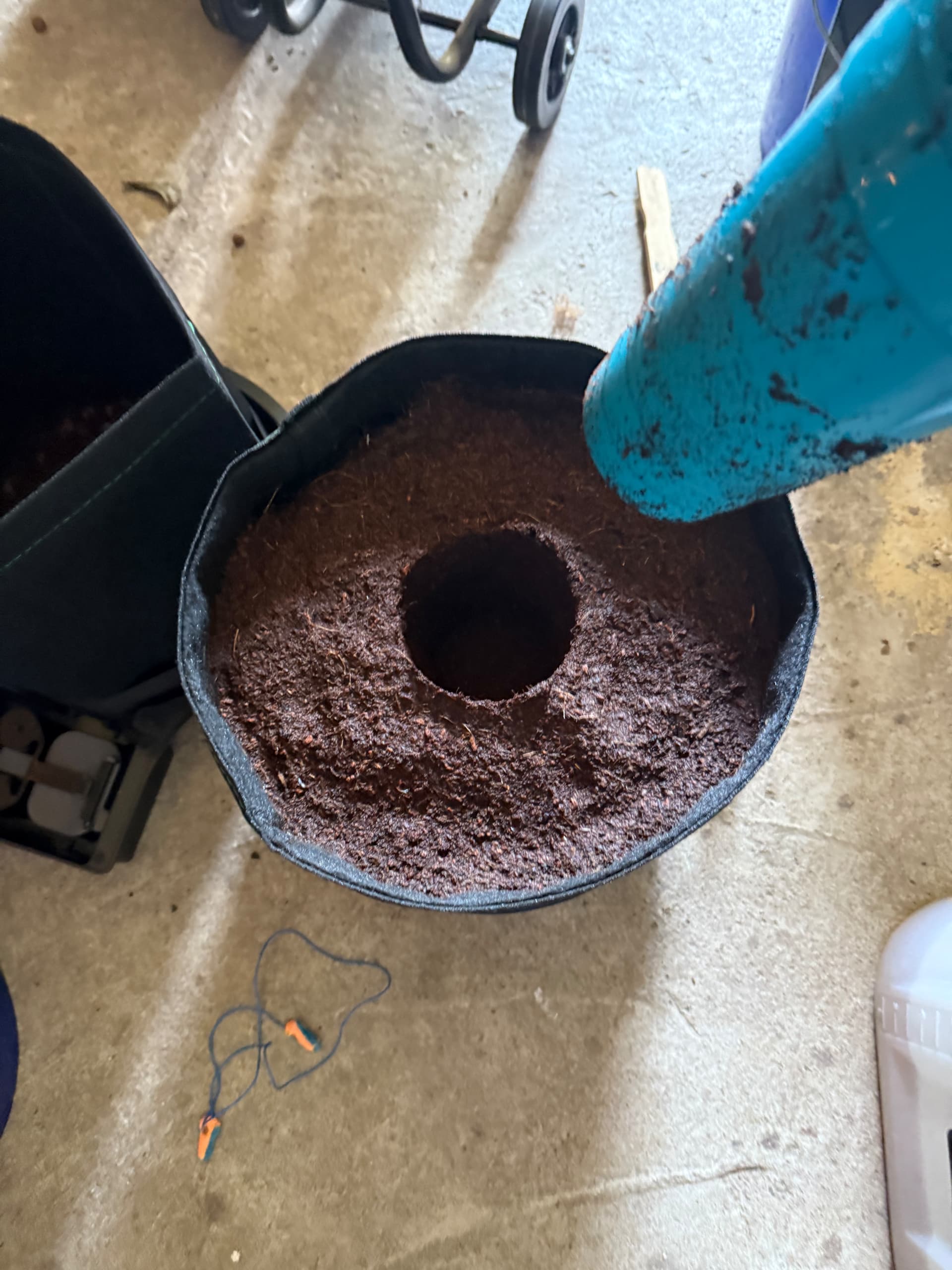 For those of you that want to know how I grow well here you go. When transplanting to the Five gallon Geo pots. I put an 1 to 1 1/2 of hydrotron balls (clay pebbles) then put my coco to about 2 inches from the top of the bag. It will shrink some when you wet it. But I put a solo cup in the middle to make a void for the seedling. I leave the cup in the void and water to runoff. (If you don’t leave the cup it will backfill the hole.) With 5.8 phed 900 ppm of feed. I won’t have to water again for probably 5 to 8 days. Then I will do that one more time in the trays. Then when the pots are light I will turn on the autopots.