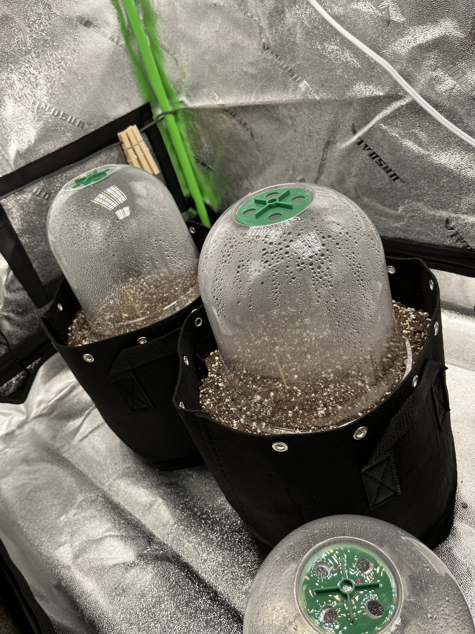 Looking good I use the same domes I leave them on for one to two weeks the first couple days I spray the top of the soil and the inside the dome then after that keep a eye on then leave the domes off