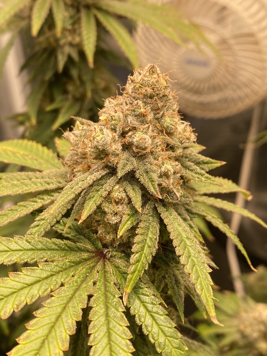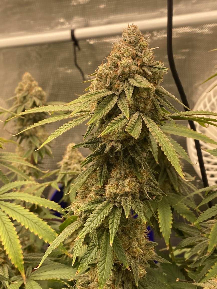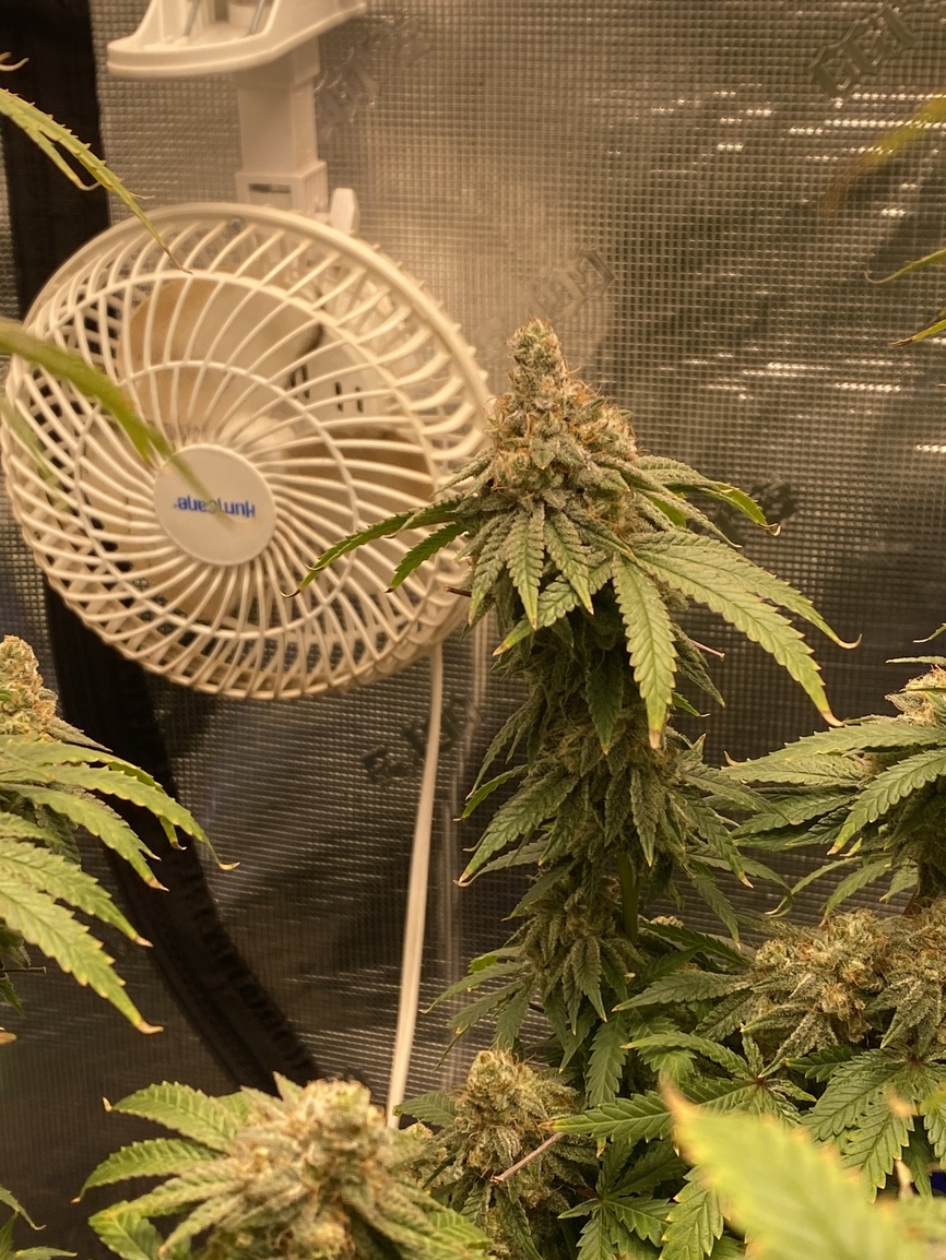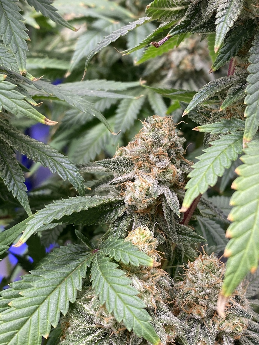 Jungleboys seeds. The Plant that was in week 5 of flowering that I took the clone from as it was the winning pheno lol. She smelled the best. took forever to root and even longer to revert. She has some root system though and she is big. Biggest leafs I’ve ever seen on a plant under 8feet tall. One on the right is a feminized willies kush cake from seed junky genetics I’ve topped them both and then topped again. The seed junky plant I’ve don some lst and some supercropping and some topping she’s kind of a mess but I’ll see.