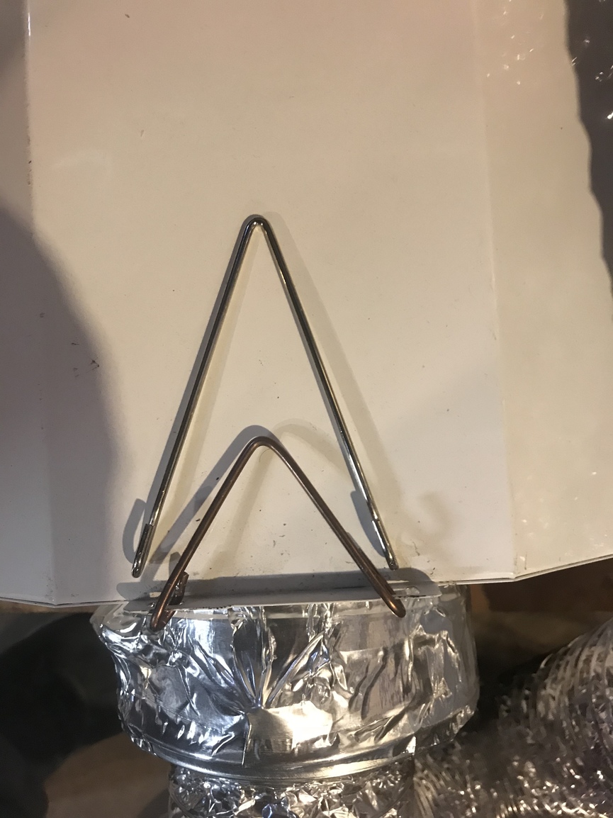 The light has been hung and the ducts connected. I didn’t have the space to use 6” ducting since my cabinet is only 3 feet wide so I cut some 4” holes in a pair of 6” duct caps and connected some 4” ducting. I also made some smaller hangers for the light to gain me a few more inches in height.Just barely made it fit