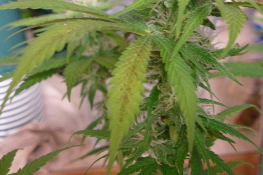 Ok, I need some input…… Soil-Hyponex potting soil; Soil in 3 gal pots; Hydroponic- N/A; Coco-N/A pH - 5.8-6.2 runoff. No Nutrients last watering. FF Tiger Bloom 1 tsp, Big Bloom 1 tsp /gal on prior feeding to that one.; EC-N/A; TDS-N/A; Indoor light system. 600 watt Led + 450 watt Led; Temps-76-79 F, RH 38-40. Ventilation- 442 CFM w/carbon filter; I 18 in fan + 6 in clip on fan for a 48 x 48 x 80 Tent.; AC-N/A ; Humidifier cold/heated not being used. Guys, here is a pic of what has just come up on the bud flowers. I checked the runoff, and got a 5.8 pH. I have been dealing with I thought was a phosphorus issue, and my thoughts are that the pH is too low and locking out the phosphorus. Soooo, I flushed the plant, and I cannot get the runoff any higher than 6.2 even if I am flooding the soil with ph water that is 9.0… At this point, for a first grow ever, I am not going to use this same soil again. But could I still get some input please? Thanks ahead for anyone that responds…![]()