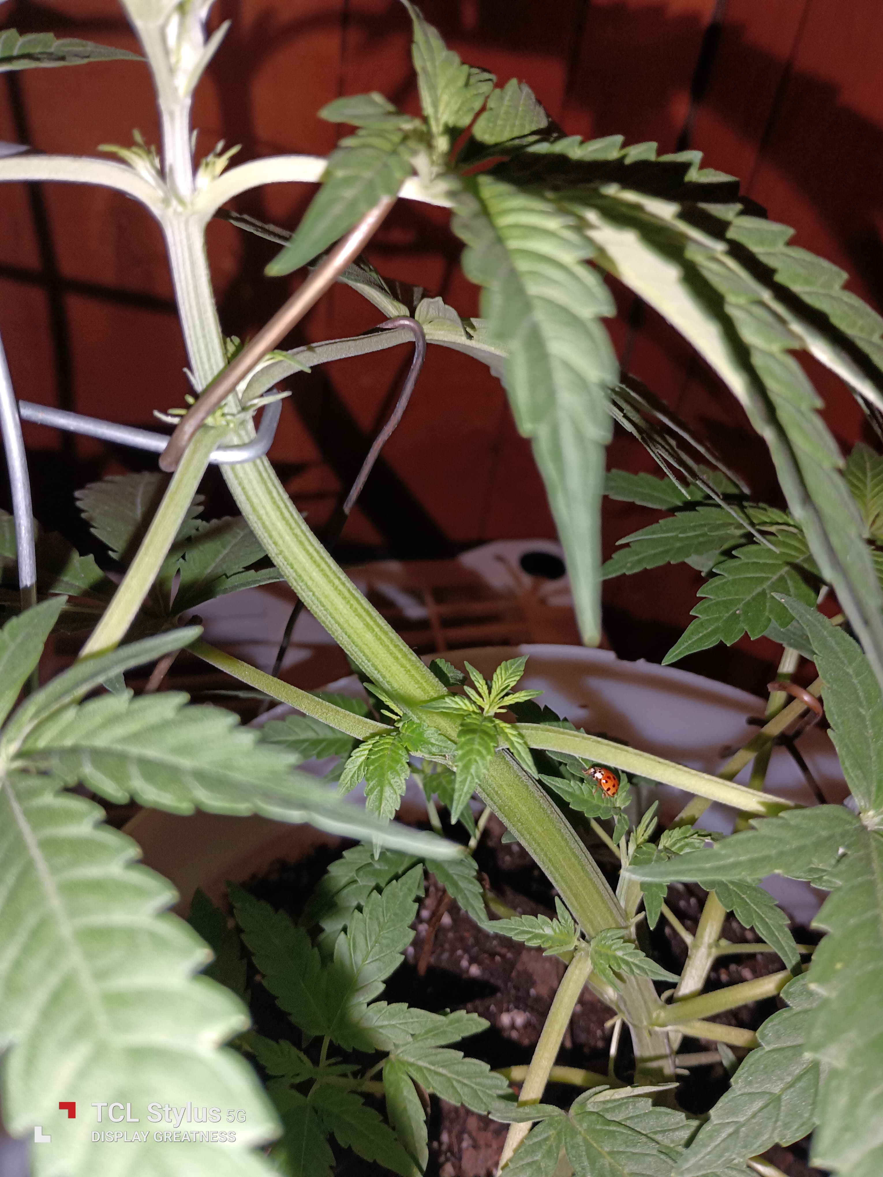Progress Report and also have a couple questions nothing to major. The Second photo is of the lowest fan leafs they were the very first to grow they are turning a bit yellow and the first is of the very next node of fan leaves right above it as you can see they are doing fairly well is my novice opinion. What should I do about those two yellowing leafs, should I prune them or just leave it be like I have been? I haven’t done anything to this Photoperiod except intensive LST. No topping, no pruning, etc ONLY LST has been done. I give nutes everywhere water with Advanced Nutrients pH Perfect Micro (1.5 mL per Liter), Grow (1.5 mL per Liter), Bloom (1 mL per Liter). She is in a 4 gallon pot and I give her a full Liter once or twice a week (depending on how fast her soil dries). I haven’t checked pH a single time, I haven’t checked humidity a single time, I haven’t cut a single leaf off, I haven’t measured light exposure, RH, I keep temp at a constant 69°-70°. This girl is about 4 Weeks and 3 Days old as of today she has 8 nodes (on main stem) with 9th node starting to pop up. She has had constant ladybug attention but I have yet to find any other bugs on her or in her medium. I have her on a 20/4 light cycle with cooler day and warmer nights. Her longest node is about 2 1/4 inches. And her overall length is standing straight up is about 15 inches (or 1 ft 3 in) and she is as I said before about 4 1/2 weeks into her veg stage. What are you guy’s opinions because to me she looks pretty good besides her perpetual stretching and light foliage. I would fill out the checklist people like to post on here but I have no way of accurately measuring over half the stuff on it so with the info I have provided and the pictures just give me your honest opinion about how she is doing.