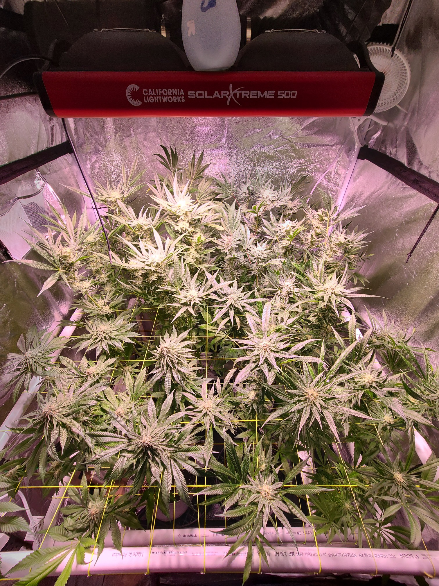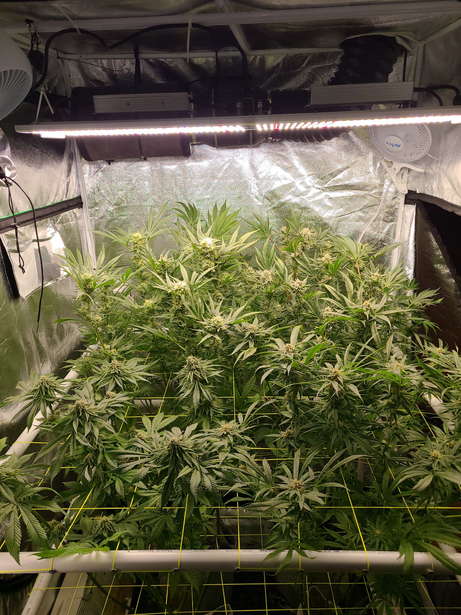 Loving the extra light and getting a nice reaction to the IR from what it looks. Keeping her at 85% power since id rather play it safe. Got the new tent setup as well, and hung the Cali in there. Its allowing me to run both on the circuit but keeping an eye on everything as I still want to run a second in. Gorilla zkittlez will come down first but she wants to go a little longer. Probably starting a few day flush on her soon and letting the others rock.