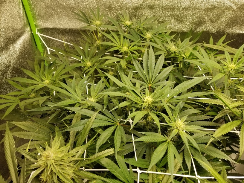 The purple haze was stretched the hell out and tucked every few days to keep the buds as level as possible. She is looking nice, buds are getting on in size and smell amazing.