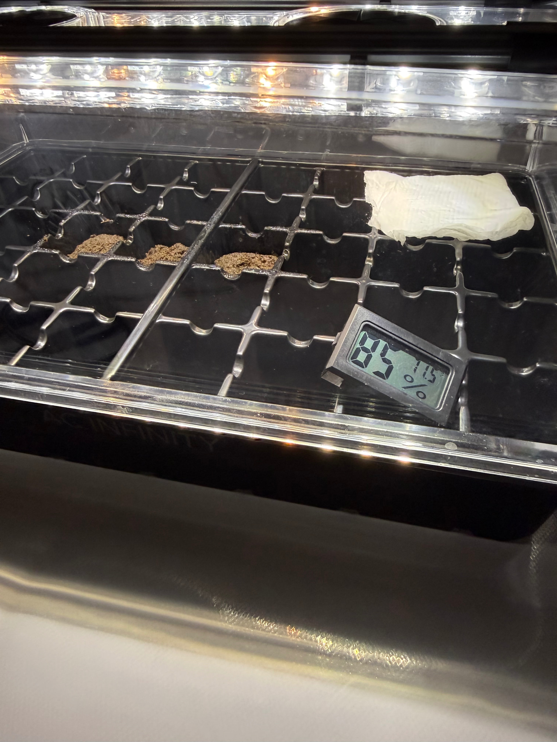 Not as elegant as @IsItSticky, but germ is complete over here too. Beans in FF soil with a sprinkle of Great White and taproots dipped. Solo cups for humidity domes.