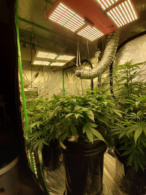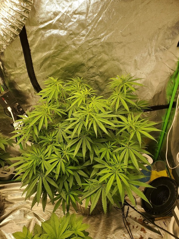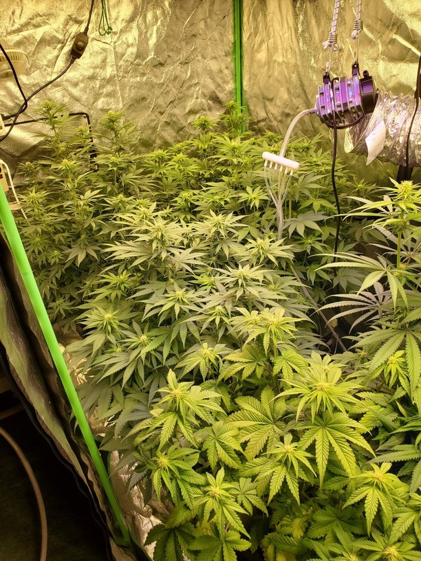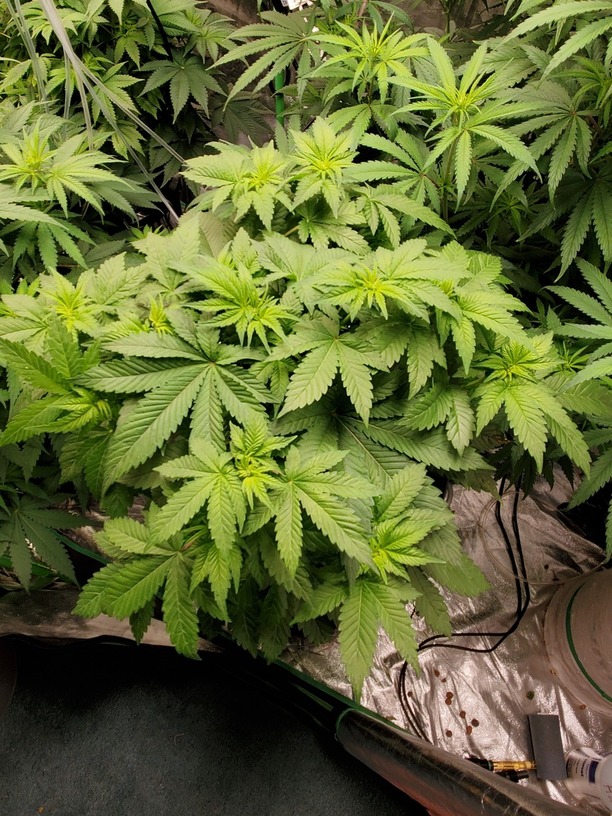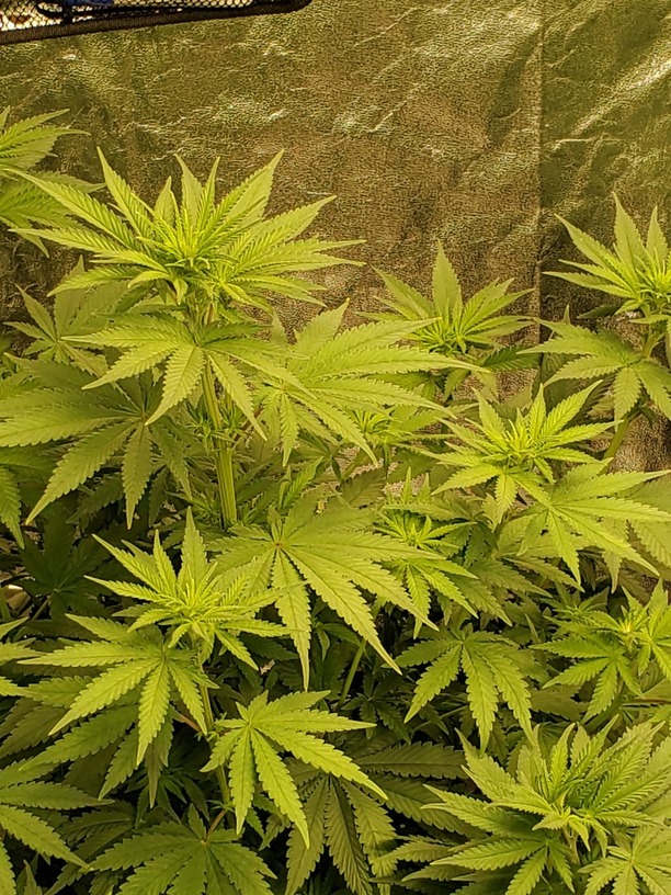 This is an 8’x4’ tent, I have 2 HLG lights 1000watt, and we are growing Ilgm purple pack and sativa pack! I got one runt purple kush but she’s a fighter and grows like a bush soon. I’m using lst on the lower branches kinda fragile but I try to be gentle. Alot of lower leaf removal since indica plants are bushy and can choke themselves with fat leaves! Switch to 12 /12 this weekend. They may be small but the spurts are greater! I want flowers baby!!