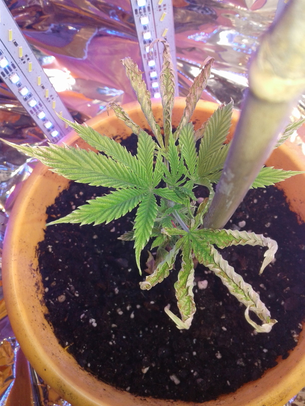 Ph is 6.0 I mixed 50/50 fox farm, ocean forest fertalizer/Mother earth coco full. No additional nutrients at all. Soil was watered rite before pic. I keep entire field slightly damp as much as possible so it’s all equally moist, no hard, dry areas. Today those leaves in middle of pic are looking more lustrous but tips are still ‘turning’ on me. The sad lookin ones from yesterday’s pic have completely curled up, but center of plant looks beautiful. I used LEDs about 20 inches away. Totals 60 watts, it’s called 'cool white-5000k lighting.