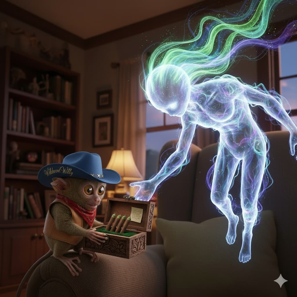 Willy retreated to the refuge of his hotel room and placed a call to his oldest friend. Moments later, the door floated open, and in shimmered Xylos, a being of iridescent gas and pure energy. Xylos didn’t speak with a voice, but with a language of pulsing light and resonant sound. The air crackled with anticipation as Willy prepared to reveal the mysterious gift, knowing that whatever challenge lay ahead, he wouldn’t face it alone.